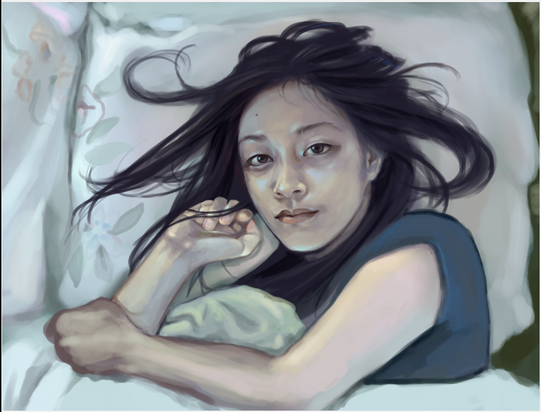 In this self-portrait, I simply wanted to capture a moment that I tend to experience when I wake up. Well, many of us do this I’m sure. I stare at the ceiling. I space out. I let my mind go wherever it goes — whether I’m anxious about something, feeling guilty, wondering what I’d just dreamed about, or what I really wanted this painting to be about: